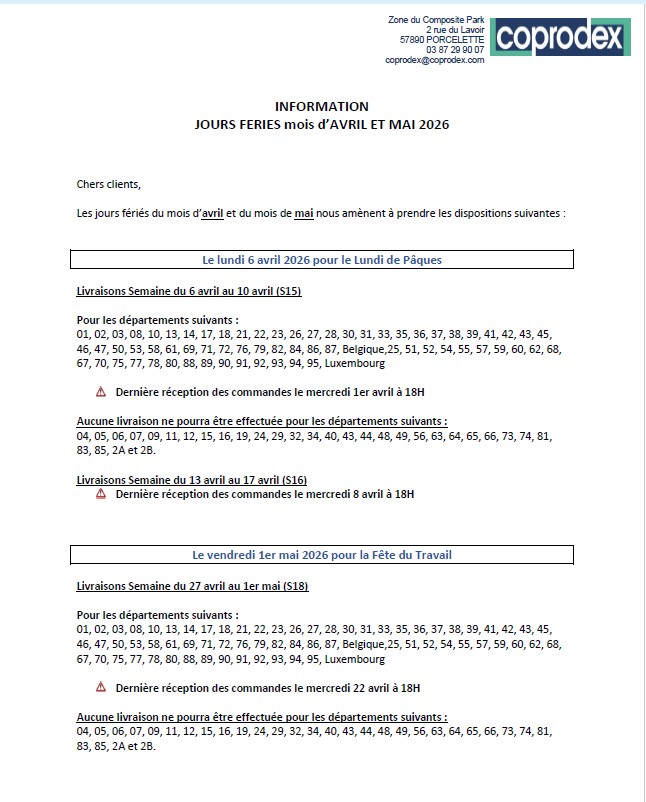 Suite aux jours fériés d’Avril et de mai, nous sommes contraints de prendre des dispositions pour les livraisons. Merci de prendre connaissance du courrier ci-dessous.