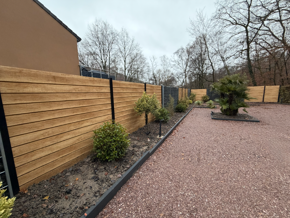 Nous avons récemment réalisé une clôture en aluminium plaxé effet bois, pensée pour allier design contemporain et intégration naturelle dans le paysage extérieur.