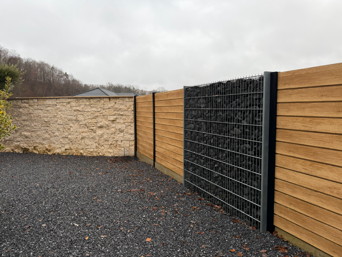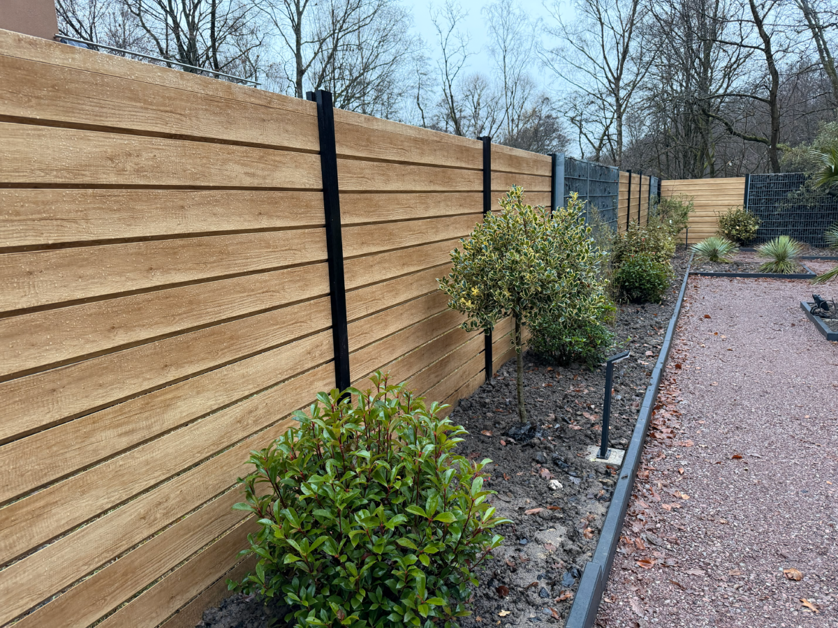 Une clôture qui combine l’élégance du bois avec la robustesse de l’aluminium, offrant une ambiance chaleureuse tout en restant parfaitement moderne.